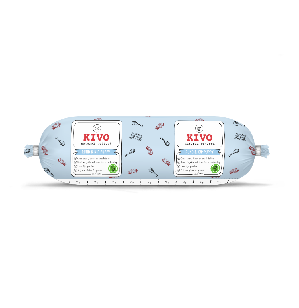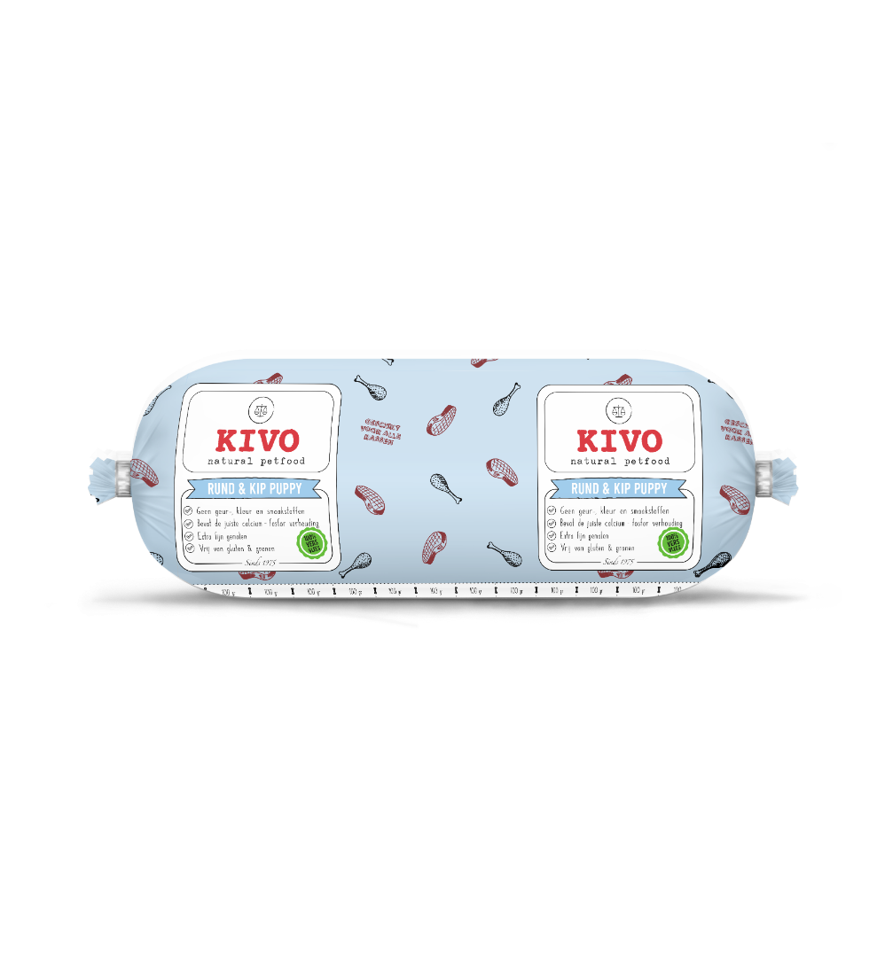 Deze voeding is een verse diepgevroren complete maaltijd die geschikt is voor elke pup. Deze voeding bevat vers rundvlees en vers kippenvlees. Kivo rund & kip Puppy bevat alle essentiële voedingsstoffen, bouwstoffen, vitaminen en mineralen die uw hond nodig heeft en is geschikt om dagelijks aan uw hond te geven. Het is samengesteld uit de beste ingrediënten en bevat de juiste calcium - fosfor verhouding om te voorkomen dat uw pup groeipijnen krijgt. Ook is deze voeding fijner gemalen zodat uw pup het makkelijk kan eten.