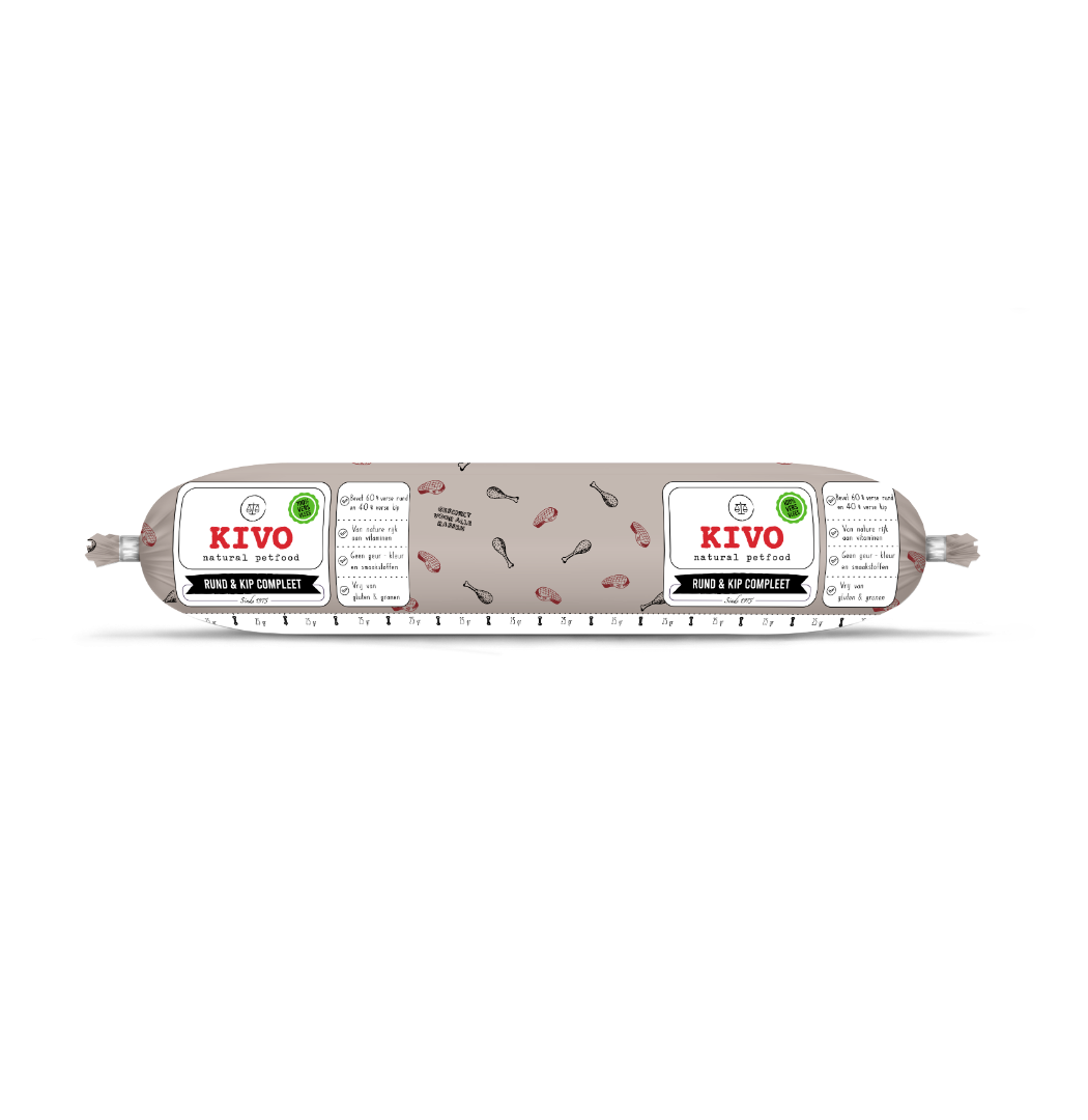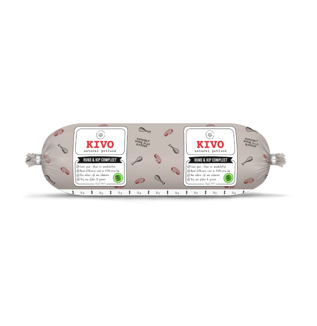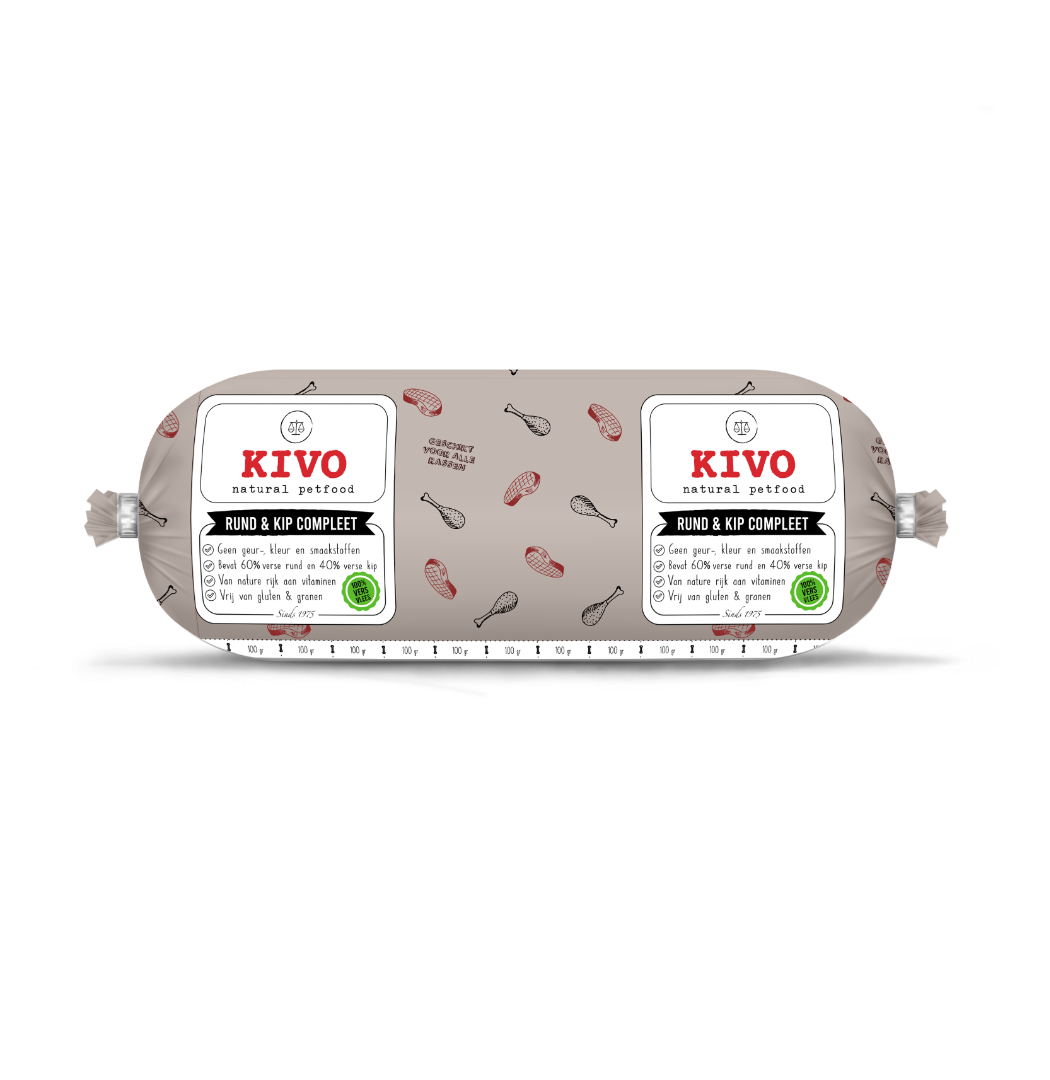 Kivo rund & kip compleet bestaat voor 60% uit vers rundvlees en voor 40% uit vers kippenvlees.