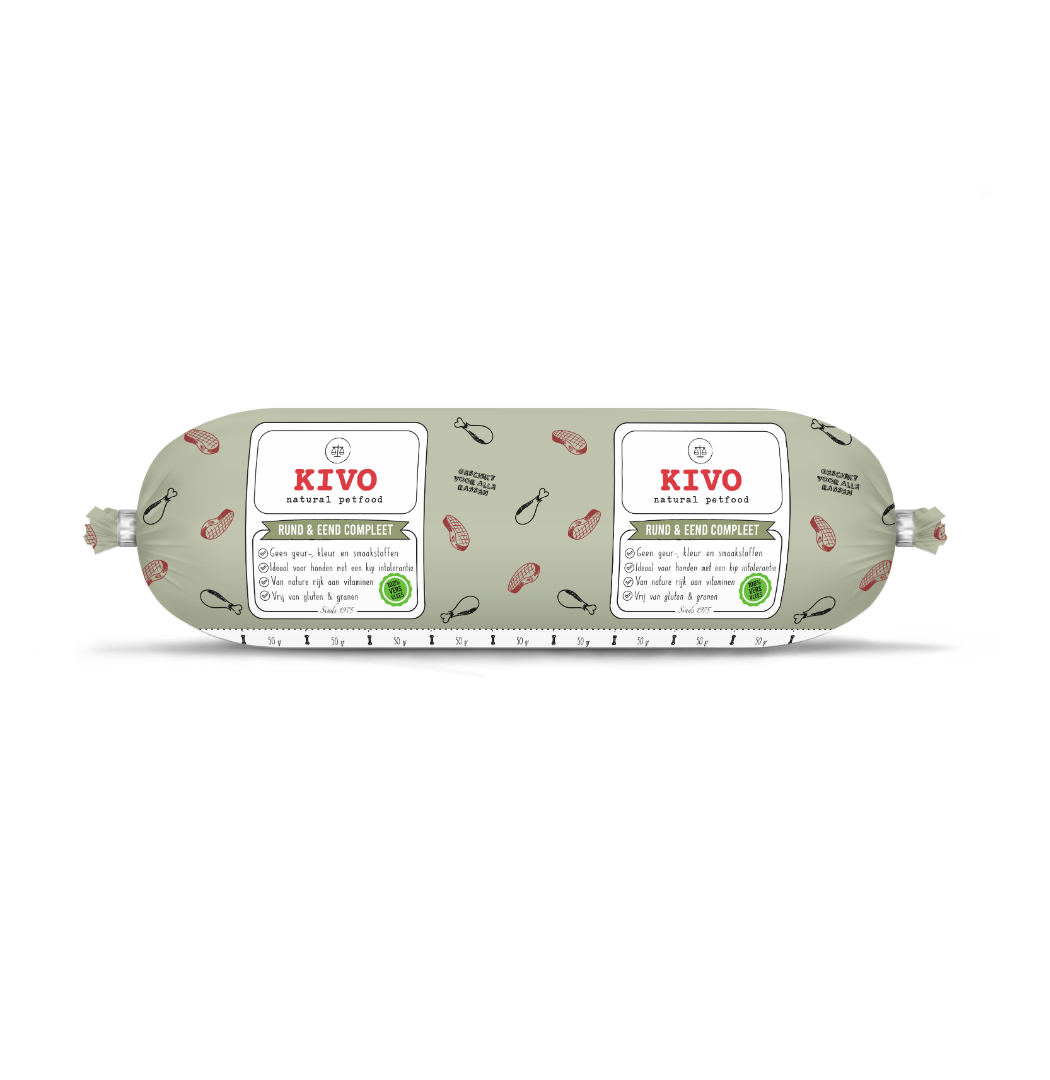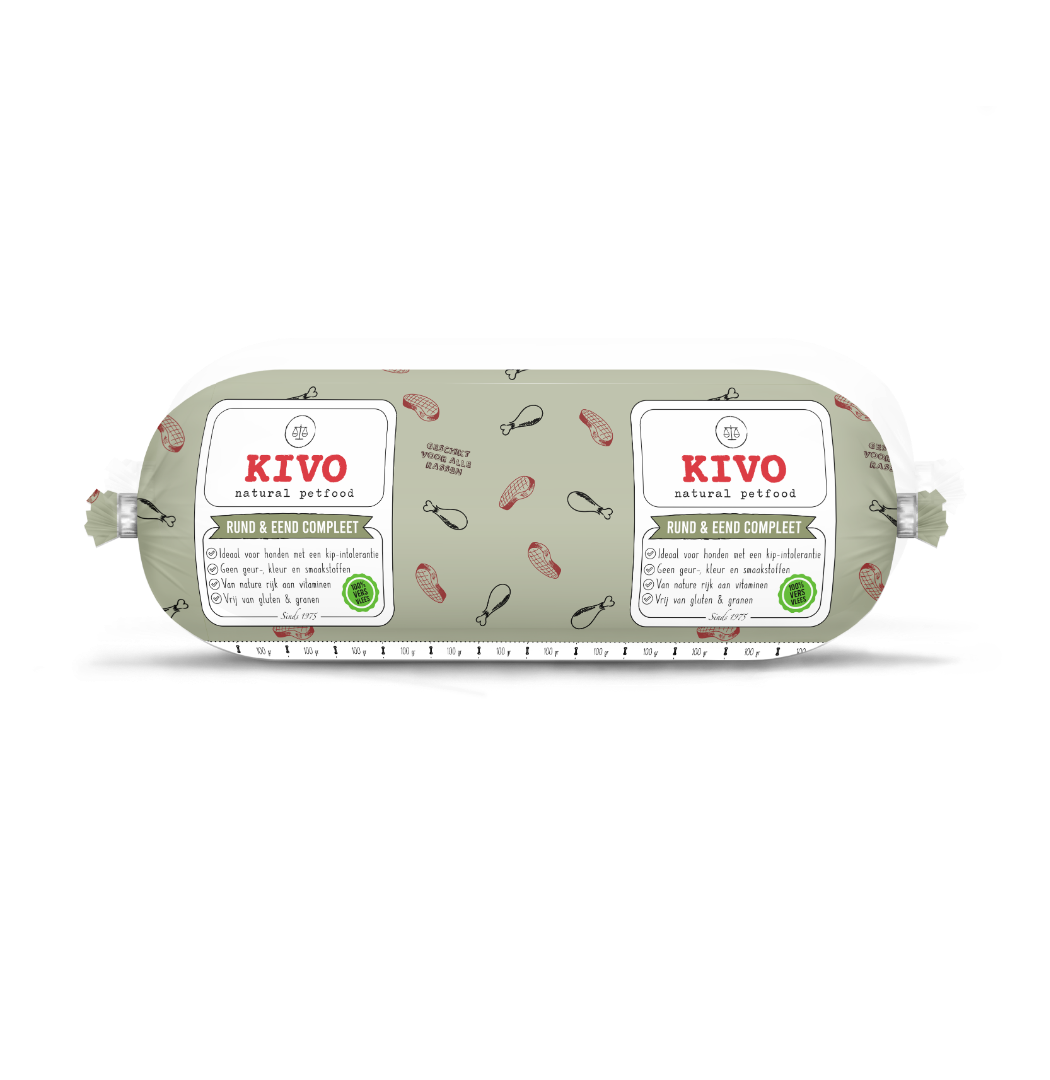 Kivo Rund Eend compleet is een verse diepgevroren complete maaltijd die geschikt is voor elke hond. Deze voeding bevat vers rundvlees en vers eendenvlees. Deze complete maaltijd bevat alle essentiële voedingsstoffen, bouwstoffen, vitaminen en mineralen die uw hond nodig heeft en is geschikt om dagelijks aan uw hond te geven. De vitaminen en mineralen die in onze maaltijden zitten worden gewonnen uit natuurlijke bronnen. De natuurlijke bronnen in deze maaltijd zijn : hoefdier (rund) en gevogelte (eend). Deze bevatten hoogwaardige ingrediënten zoals organen als hart, nier, lever, long, pens en milt ook bevat het spiervlees en karkas.