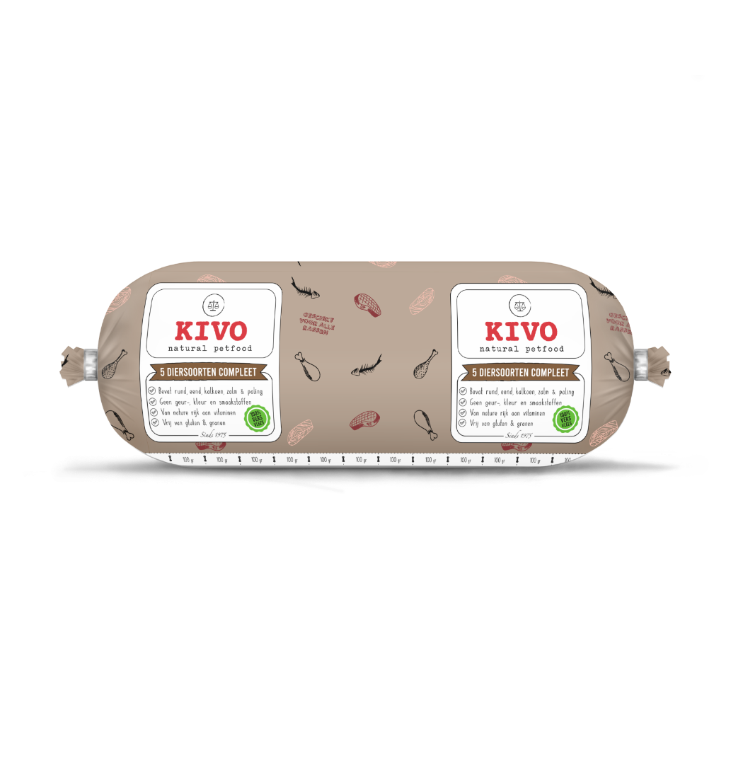 5 Diersoorten mix Kivo bevat alle essentiële voedingsstoffen, bouwstoffen, vitaminen en mineralen die uw hond dagelijks nodig heeft en is dus geschikt om elke dag aan uw hond te geven. De vitaminen en mineralen die in onze maaltijden zitten worden gewonnen uit natuurlijke bronnen. De natuurlijke bronnen in deze maaltijd zijn heel veelzijdig door de vele verschillende diersoorten. Deze bevatten hoogwaardige ingrediënten zoals organen als hart, nier, lever, long en milt, ook bevat het spiervlees en karkas. Wij gebruiken geen kunstmatige stoffen of chemische vitaminen. Wel is het verstandig om meerdere diersoorten per week te voeren omdat je hond zo aan een groter scala van verschillende bouwstoffen en aminozuren komt.